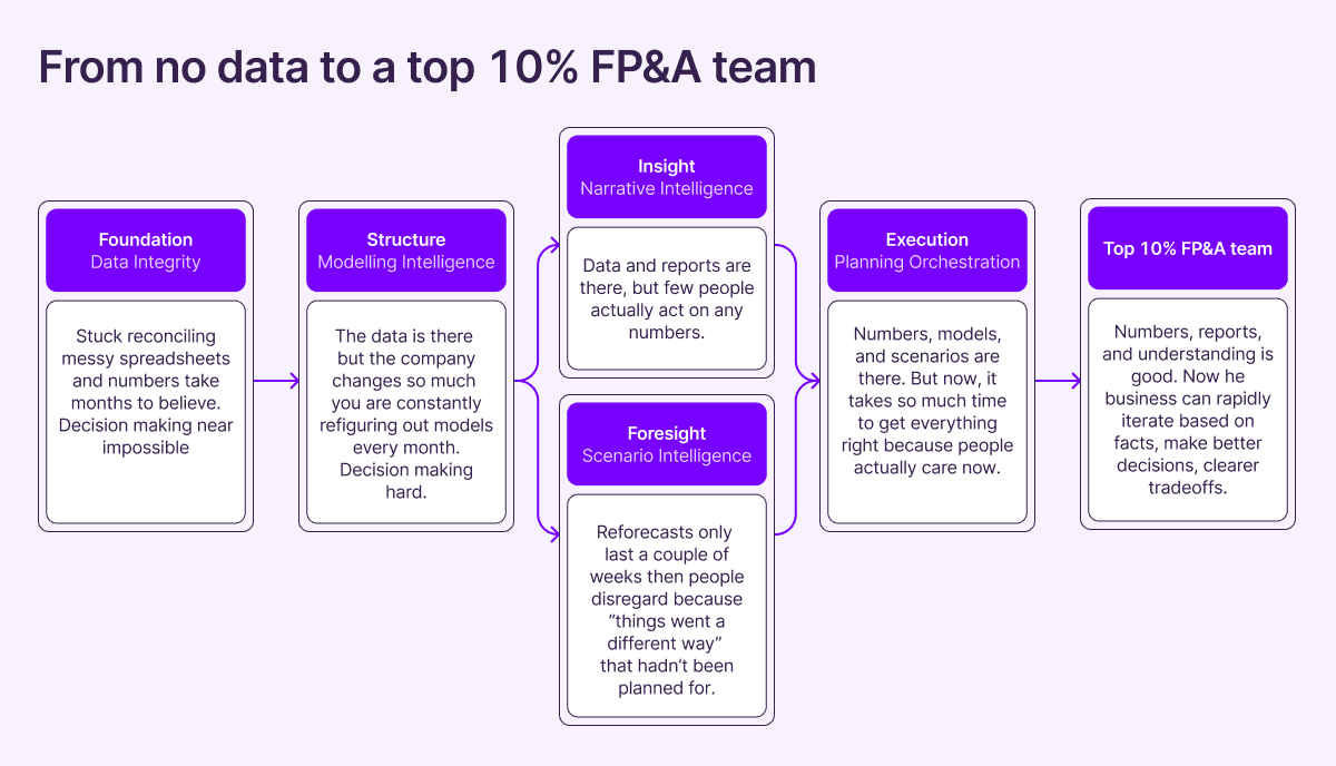 This is the second article in our series. Like the first, we’ll walk through the tactical steps we used to stabilize the FP&A team, followed by how today’s AI tools can achieve them now.