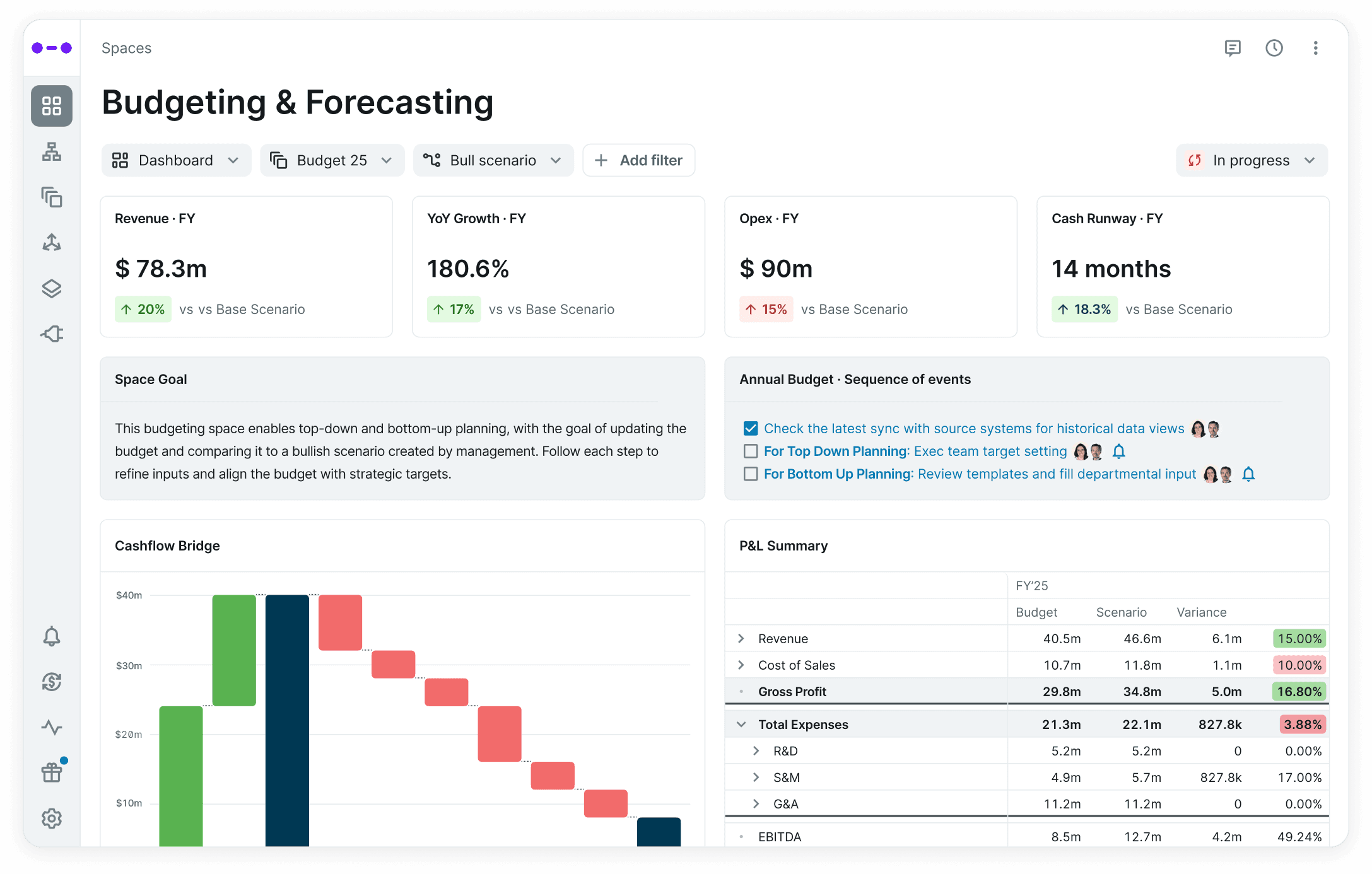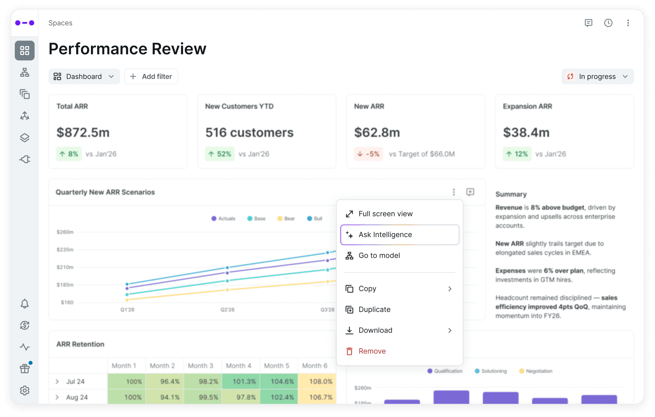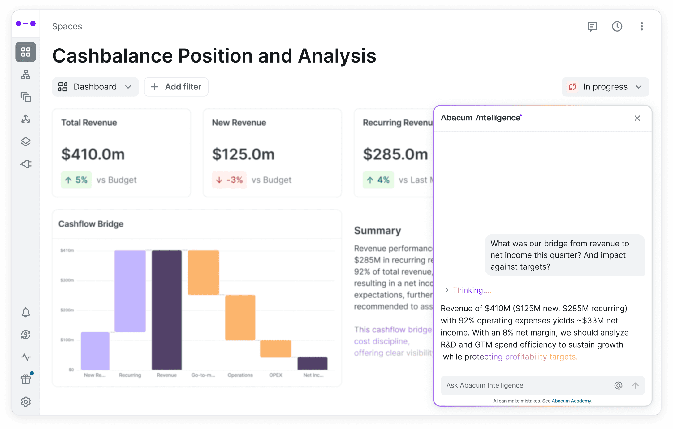 Abacum gives FP&A real-time data, live models, instant scenarios, and AI-powered insights โ so you can keep strategy aligned with reality and make every recommendation with confidence.