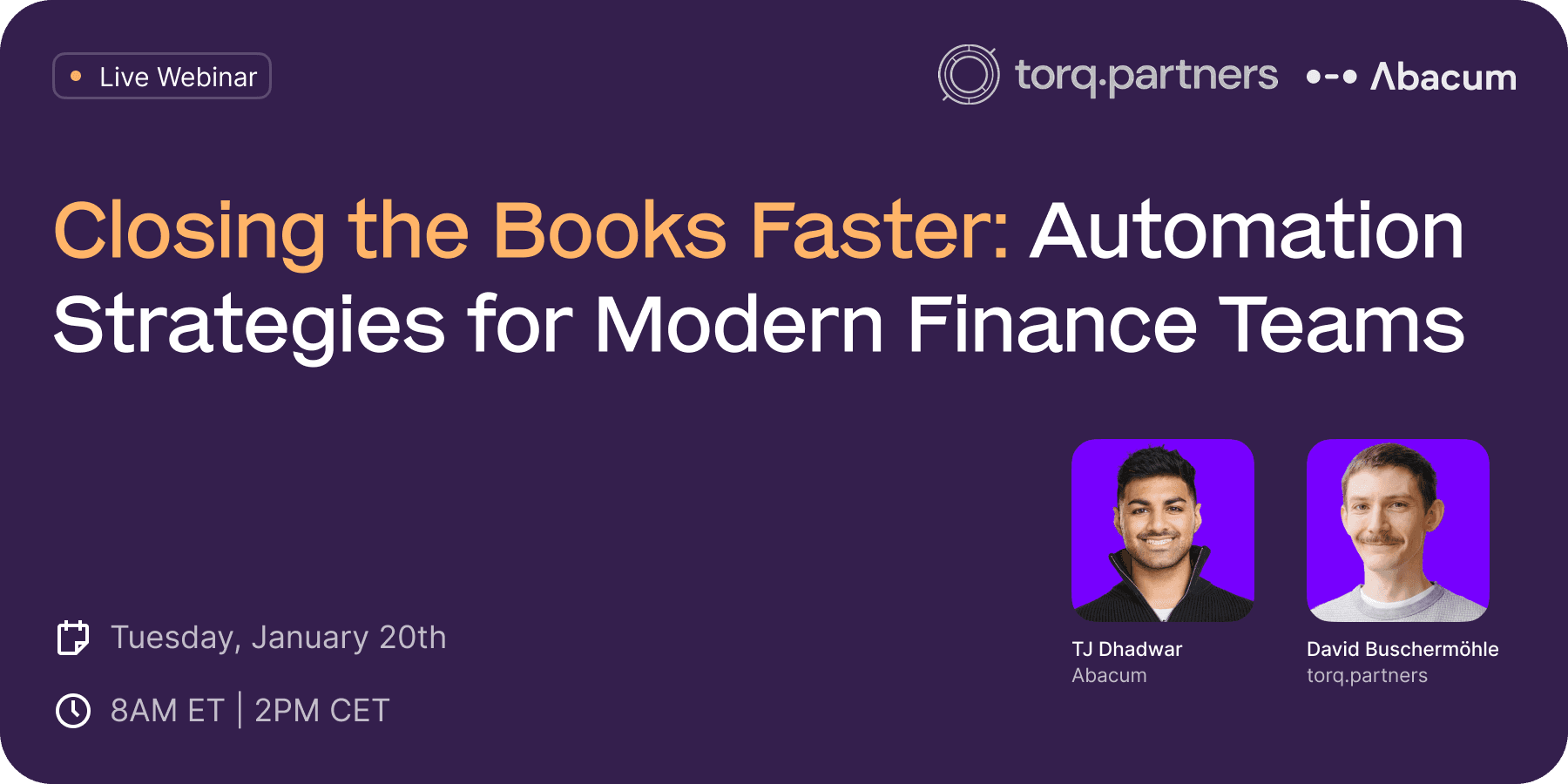 Join Abacum and Torq for a practical webinar on how modern finance teams are using automation to close faster, reduce errors, and gain earlier visibility into financial results. We’ll walk through where close processes typically break down, what finance teams should prioritize when automating, and how to transform close data into insights that support better forecasting and smarter decision-making.
